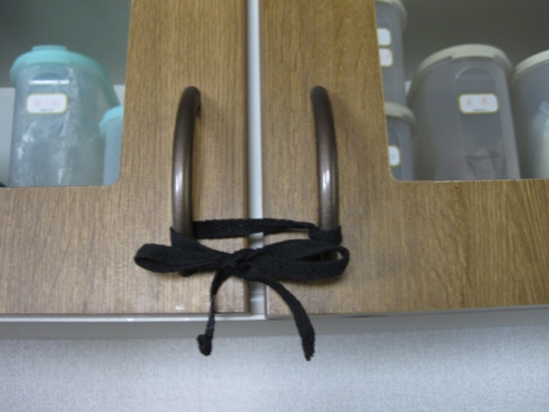 家にあった紐を把手の片方に付けただけの地震対策